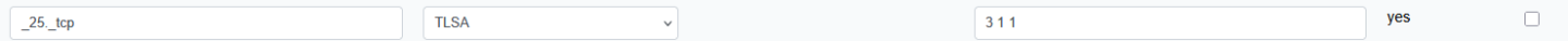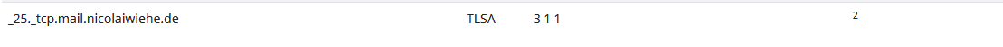 Zunächst erstellte ich den Eintrag nach der Vorgabe von mailcow (25.tcp.mail.nicolaiwiehe.de TLSA 3 1 1 Hash).