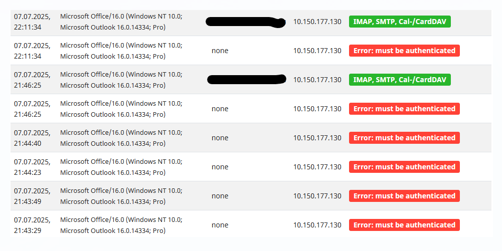 07.07.2025, 22:11:34 Microsoft Office/16.0 (Windows NT 10.0; Microsoft Outlook 16.0.14334; Pro) usr@domain.com 10.150.177.130 IMAP, SMTP, Cal-/CardDAV